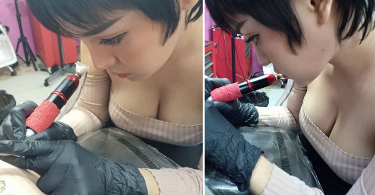 低頭認真好迷人…巨乳刺青師「托不住豐滿」雪乳狂洩!